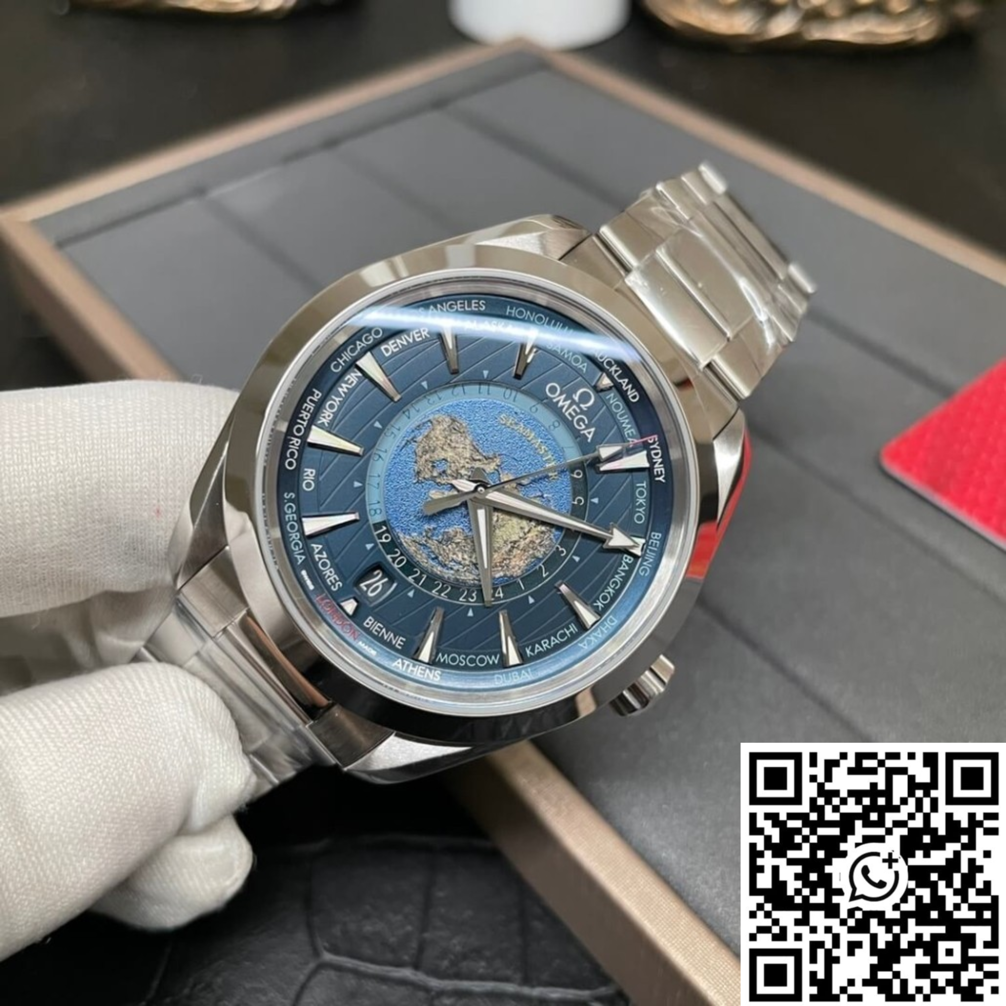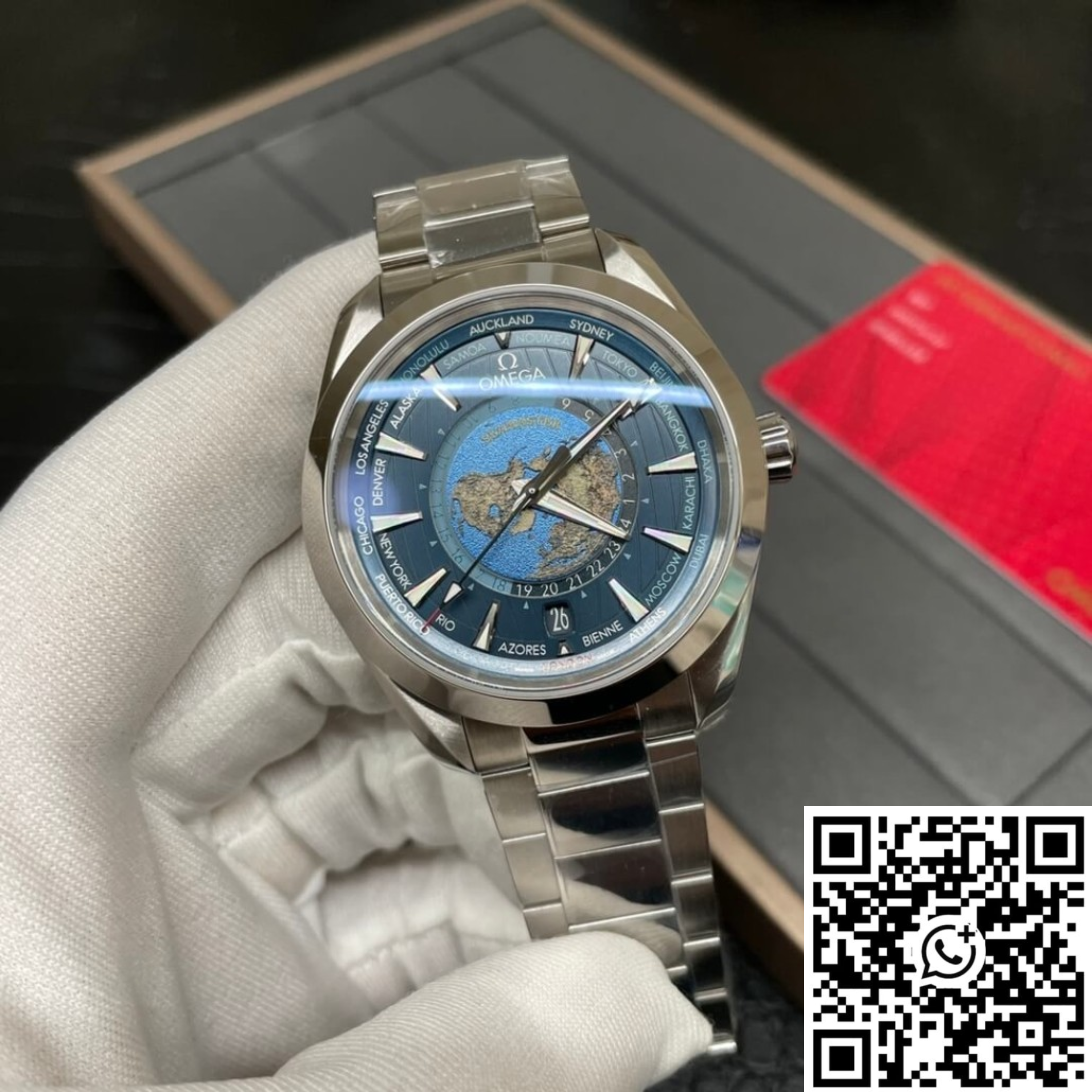 Omega Seamaster Aqua Terra 150M GMT Worldtimer Blue Dial – Ref. 220.10.43.22.03.001 Réplica Suiza 1:1 en acero inoxidable 316L (mismo que el original)
