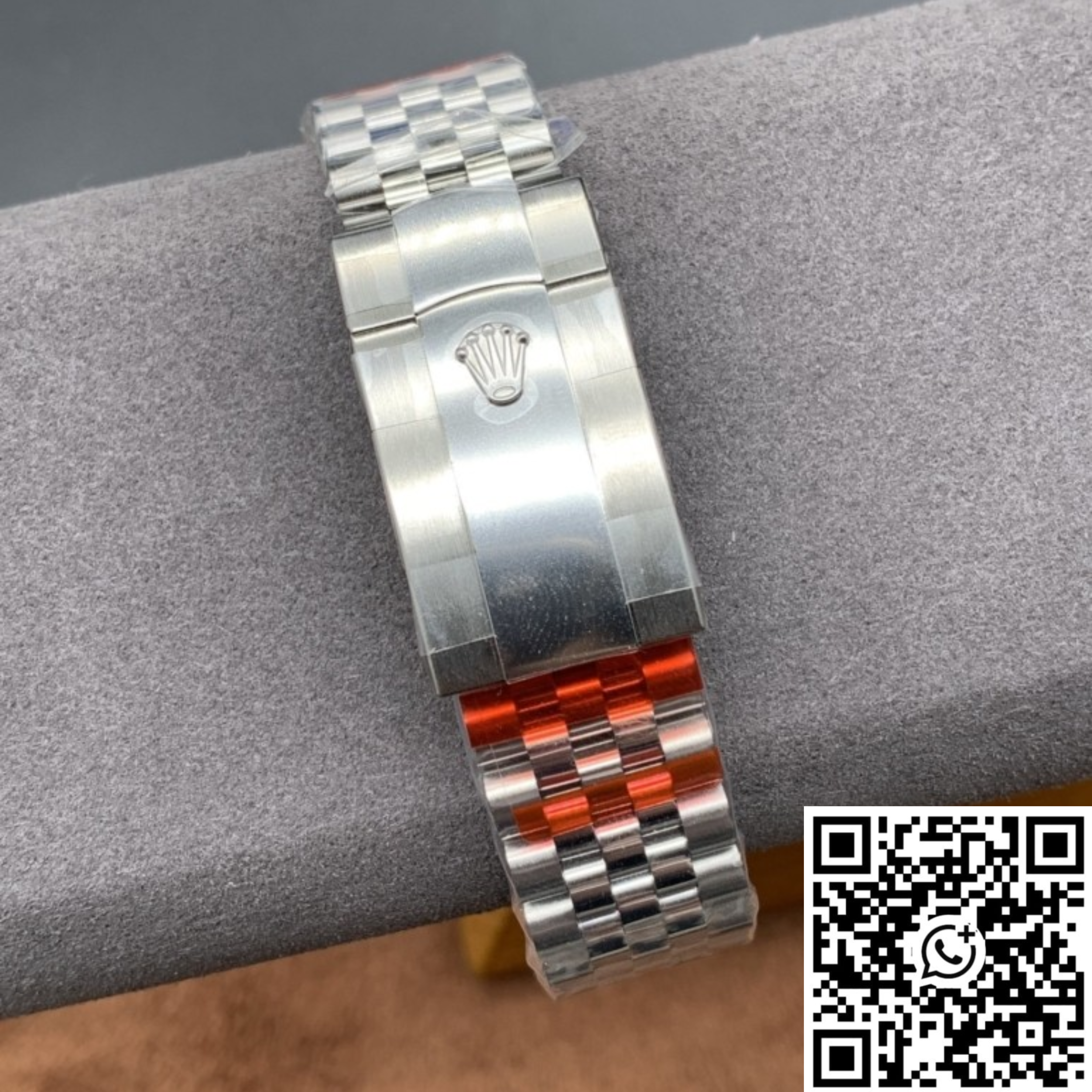 Caja: 41 mm, acero 904L (Oystersteel) pulido Cristal: Zafiro con lente Cyclops Grabado láser en el cristal a la altura del índice de las 6 (corona Rolex) Movimiento: Automático clonado Cal. 3235 Reserva de marcha: 70 horas Funciones: Fecha con cambio rápido a las 3 y segundero central Dial: Negro brillante con acabado sunburst e índices luminiscentes Chromalight (emisión azul) Bisel: Liso fijo en acero 904L pulido Agujas: Mercedes con lumen azul Corona: Twinlock roscada Pulsera: Jubilee cinco eslabones con cierre oculto Oysterclasp Hermeticidad: 100 metros
