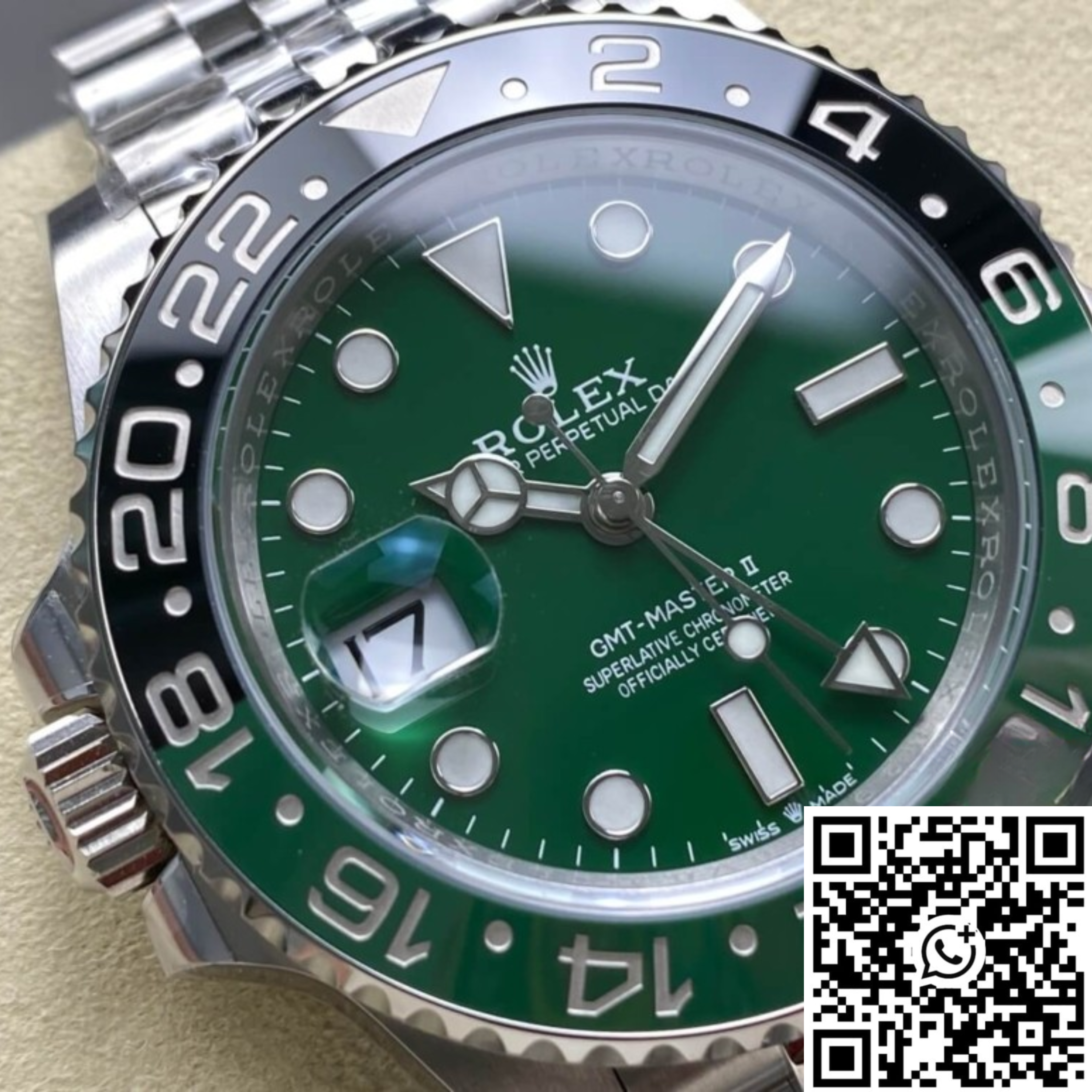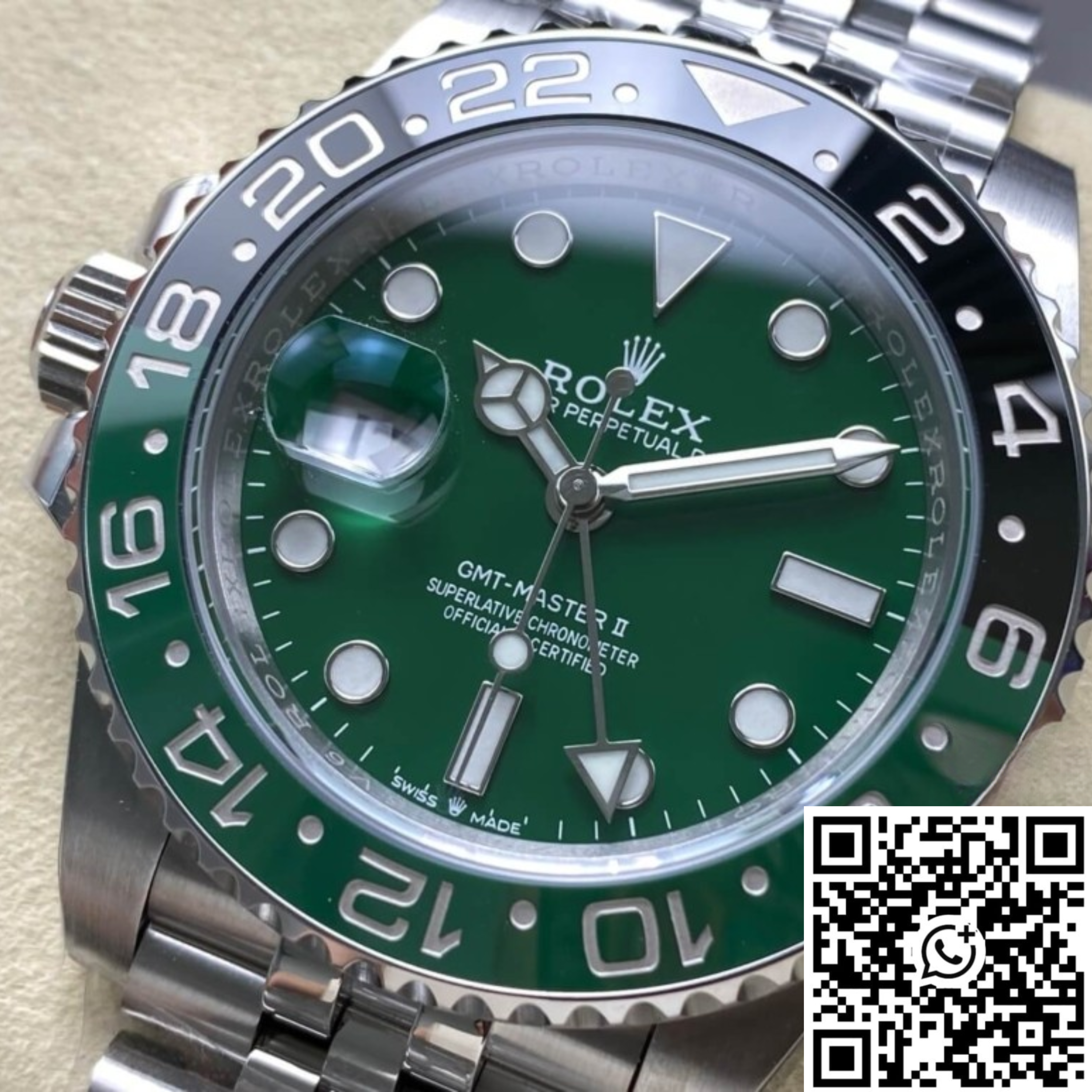 Réplica Suiza 1:1 en acero 904L con bisel cerámico verde/negro y pulsera Jubilee — La revolución zurda del GMT