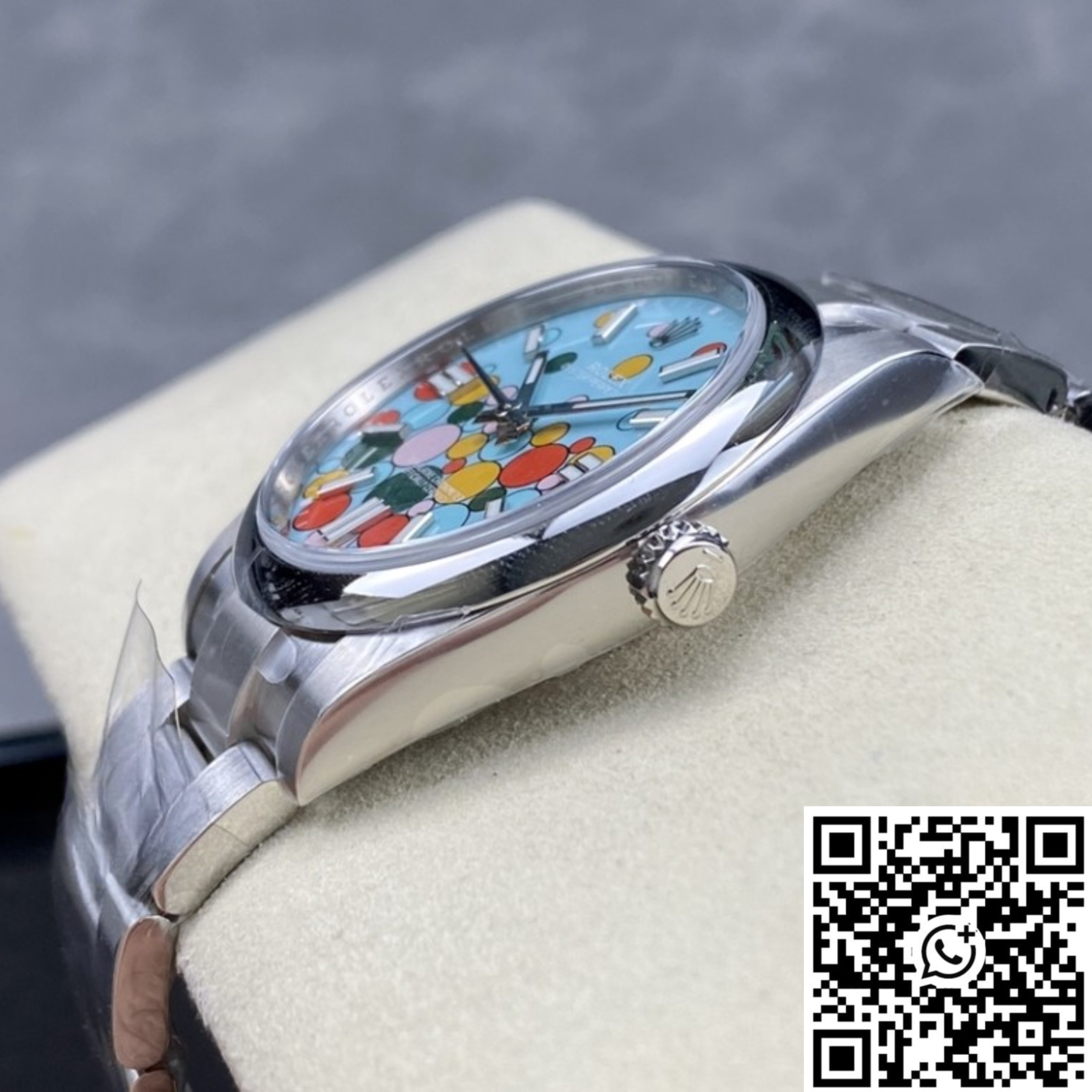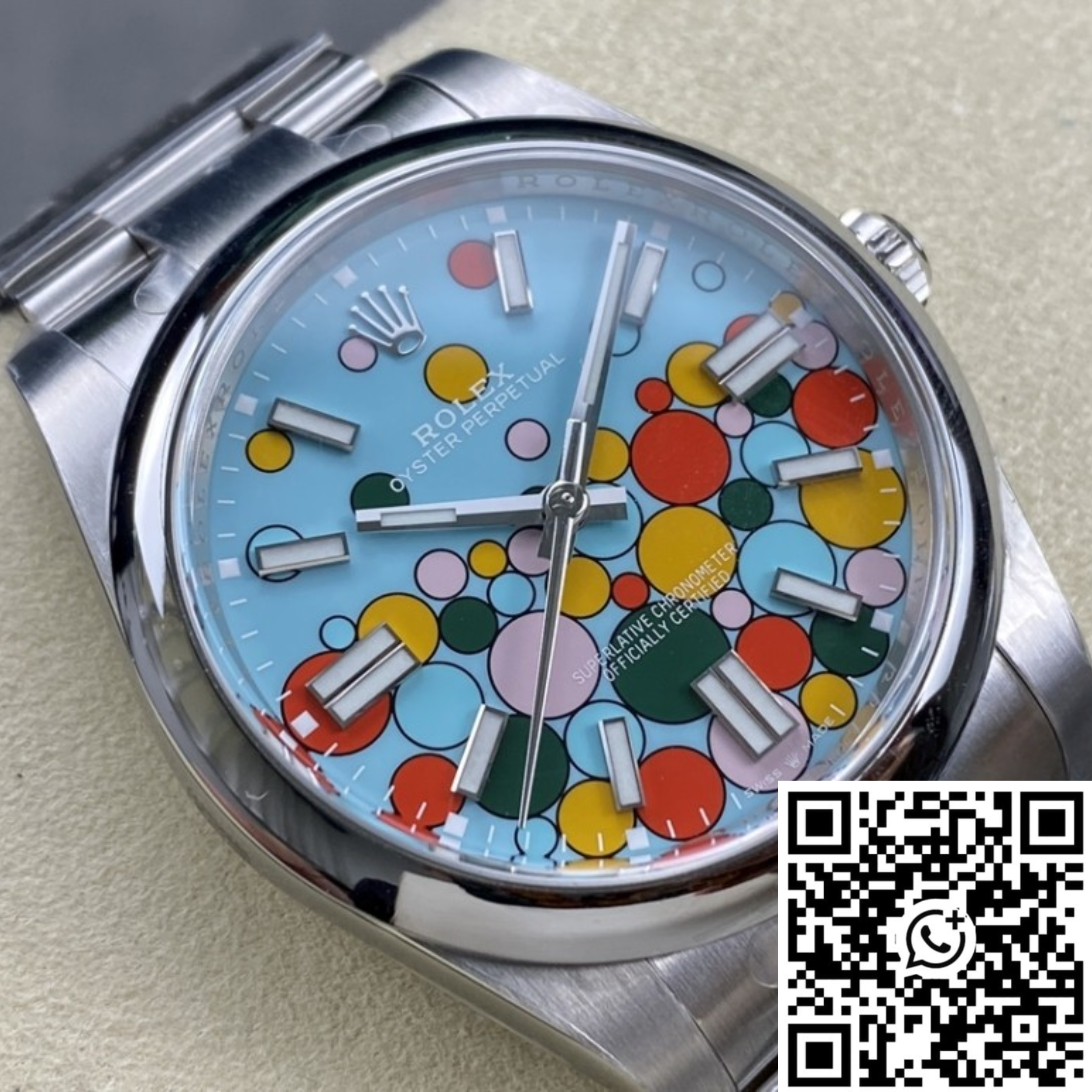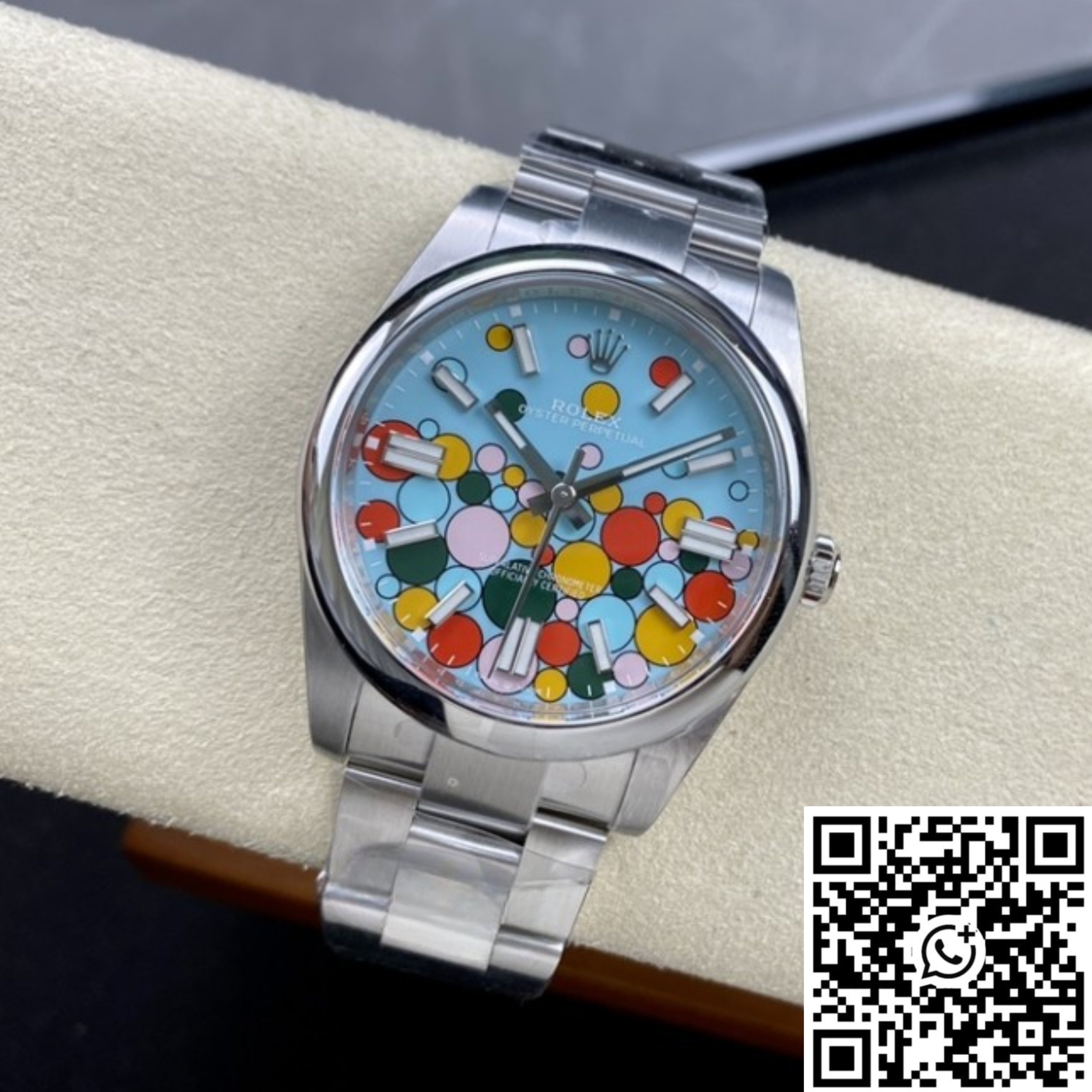 El Oyster Perpetual 41 en dial turquesa «Celebration» es uno de los modelos más virales y deseados de Rolex en los últimos años. Su dial artístico de burbujas multicolor sobre fondo turquesa lo convierte en una pieza única: minimalista en su estructura, pero absolutamente llamativo en su esfera. Un reloj que llega directamente a la lista de espera en el original — y que en réplica 1:1 luce igual de brutal.